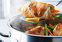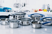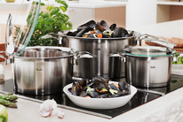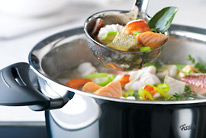 Приготовление на пару самый простой и наиболее щадящий способ приготовления блюд. Он подходит для мягких фруктов и овощей, для рыбы и для нежного мяса (телятина, цыпленок). Приготовление блюда в собственном соку с небольшим добавлением масла и жидкости называется приготовлением на пару. В частности, при приготовлении полезных для здоровья блюд не обойтись без жира или несколько капель растительного масла или немного сливочного масла или сливок в конце. Сочное тушение. Тушение способ приготовления который сочетает преимущества жира, жидкости и пара. Продукт немного обжаривается на небольшом количестве жира и затем медленно тушится в небольшом количестве жидкости с закрытой крышкой. Медленное тушение оставляет мясо сочным и ароматным. При обжаривании с небольшим количеством жира образуется корочка, а остающийся жир можно использовать затем для приготовления вкусного соуса. Также вы можете обжаривать продукты совсем без жира на посуде с антипригарным покрытием. Экономная варка. Варка это приготовление в большом количестве жидкости при низкой температуре. Продукты впитывают воду и поэтому увеличиваются в объеме. Варка - способ подходящий для риса и различных круп. Как это приготовить: поместите рис в холодную воду. Вам необходимы 2 чашки воды и немного соли на каждую чашку риса. Нагрейте кастрюлю на максимально разогретой электрической плите (если плита газовая или индукционная, то режим нагрева от среднего до высокого). Когда вода закипит уменьшите нагрев до минимума и дождитесь пока рис набухнет. Кастрюля должна быть закрыта, чтобы влага не испарялась. При варке продуктов, температура жидкости остается всегда чуть ниже точки кипения. КРАТКОЕ ОПИСАНИЕ КАСТРЮЛЬ. Кастрюли бывают разные. Когда Вы выбираете новую кастрюлю прежде всего Вы смотрите на материал, на дно, на крышку и на ручки. Материал кастрюли. Хорошая кастрюля сделана из качественного твердого и прочного материала. Идеальный вариант высококачественная нержавеющая сталь. Это можно понять из ее маркировки 18/10 (18 % хром, 10 % никель, 72 % железо). Такая сталь не ржавеет, ее очень легко чистить, она гигиенична и ее можно мыть в посудомоечной машине. Конусообразная форма кастрюли позволяет вставлять кастрюли друг в друга и таком образом экономить пространство (например, кастрюли Fissler из серии solea®). В хороших кастрюлях дно и стенки прочно соединены друг с другом без пустот. Внутри кастрюли переход от дна к стенке должен быть скругленным так, чтобы Вы могли ложкой или венчиком добраться до любого места. Дно. Высококачественное дно изготовлено из нержавеющей стали с вставкой из алюминия. Алюминий хороший проводник тепла; однако он должен быть полностью скрыт сталью иначе при мойке в посудомоечной машине на дне появятся белые пятна. Утолщенное дно с алюминиевой сердцевиной обеспечивает оптимальное поглощение, распределение и накопление тепла. После того как дно прогреется, его можно полностью сдвинуть на край плиты - это сохранит энергию и время при приготовлении блюд. Убедитесь что это подходит к данной плите, т.к. не каждую кастрюлю можно ставить на индукционную плиту, например. Наш Product Finder поможет выбрать кастрюлю именно для Вас. Крышка. Тщательно подогнанная крышка сохраняет тепло и жидкость в кастрюле. Это сохраняет аромат блюда и сберегает энергию. Стеклянная кры