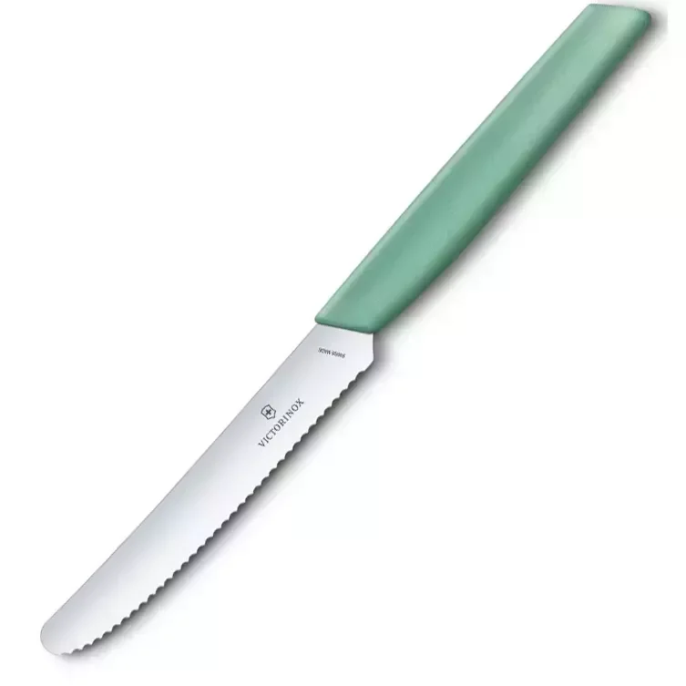 Кухонный нож Victorinox Swiss Modern Tomato&Sausage 11см закругл.нос, волн. с мятн. ручкой Victorino - інтернет магазин europosud.ua!