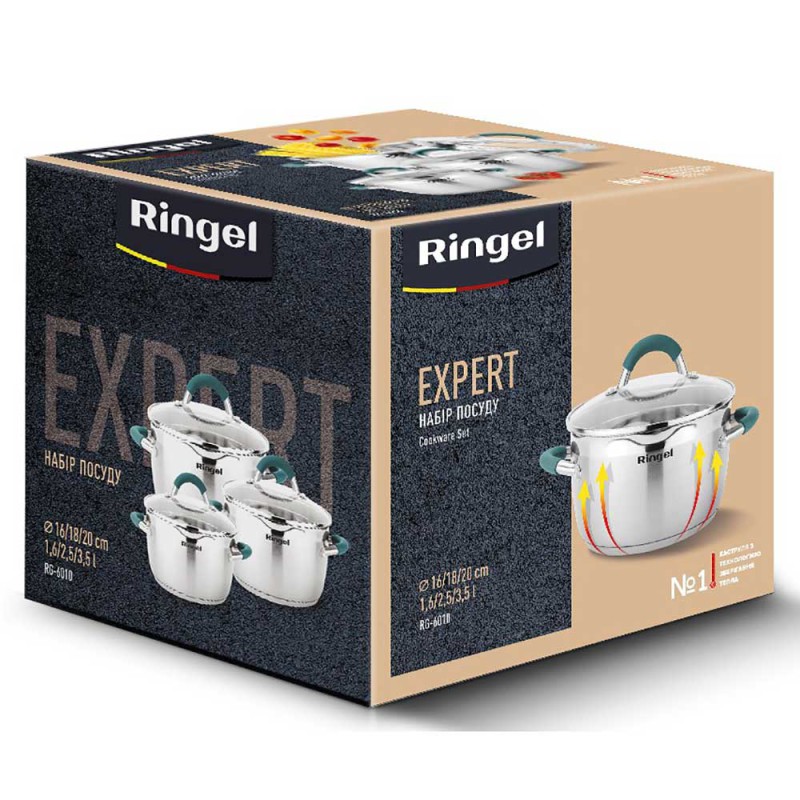 Набір посуду з нержавіючої сталі серії EXPERT від Ringel має привабливий зовнішній вигляд, відмінну функціональність і надійну та ергономічну конструкцію. Завдяки застосуванню нержавіючої полірованої сталі в якості матеріалу виготовлення, каструля EXPERT поєднує в собі естетичну привабливість і практичність.