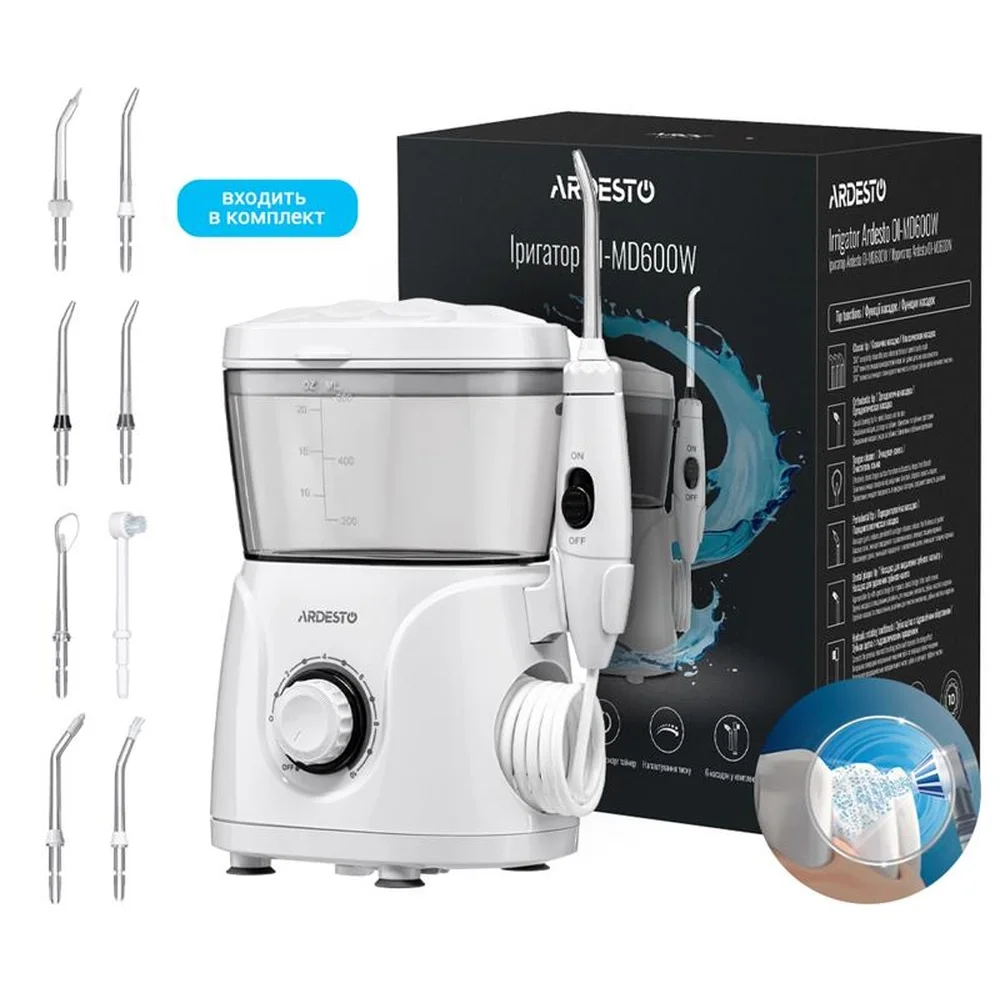 Іригатор Ardesto стаціонарний, чаша 600 мл, від мережі , 8 насадок, білий OI-MD600W - купити в магазині