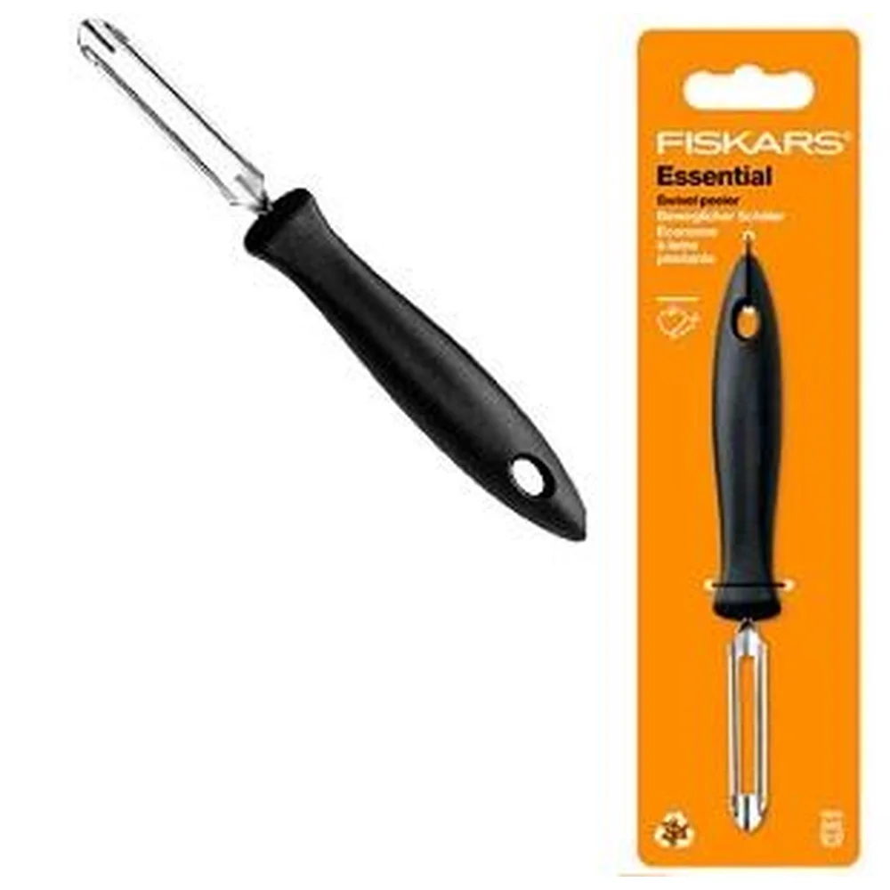 Овочечистка вертикальна Fiskars Essential, з рухомим лезом, 18.4см, нержавіюча сталь, пластик, чорни - інтернет магазин europosud.ua!
