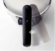 7. Накройте скороварку крышкой. Совместите пазы на корпусе скороварки и на крышке. Поверните крышку в лево так, чтоб скороварка закрылась. Индикатор на ручке скороварки поменяет свой цвет с красного на зеленый и появится флажок с кастрюлей.